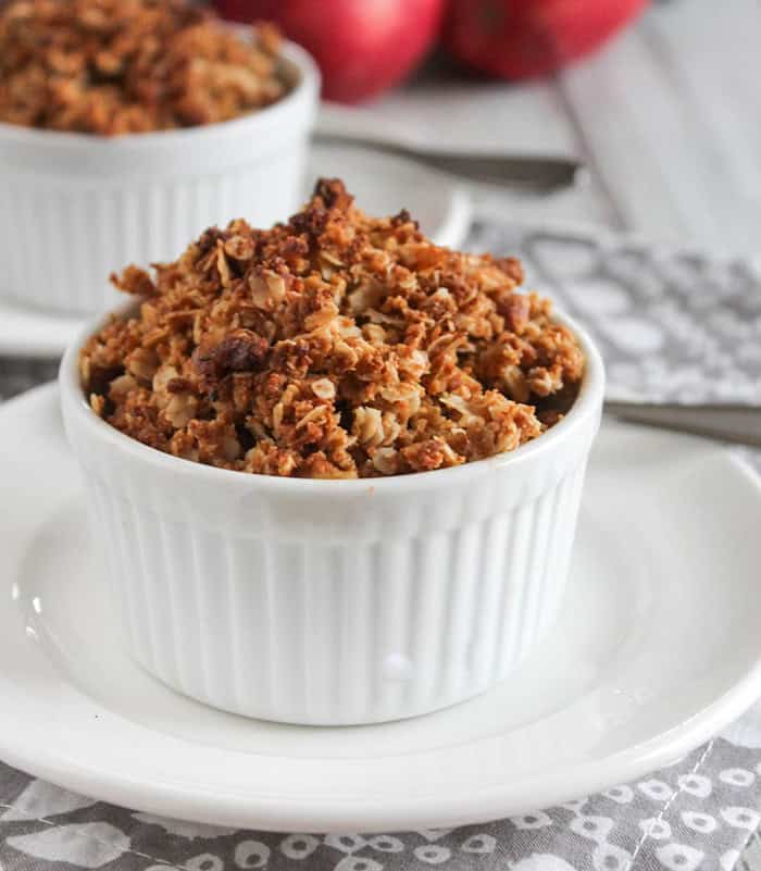 A flavorful way to serve up dessert, these mini apple crumbles bring you the warm and cozy flavors of cinnamon and apples. The topping is a mixture of oats, walnuts, and brown sugar that creates a flavor packed crumble.
