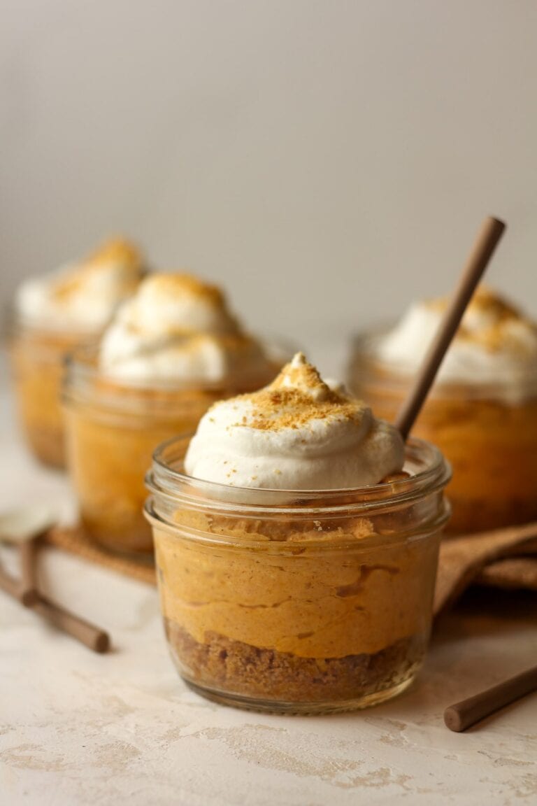 Pumpkin Pie in a Jar is a fun, portable dessert that layers creamy spiced pumpkin filling with a buttery graham cracker crust, all neatly contained in a mason jar. This convenient twist on a classic autumn treat is perfect for individual servings, and way simpler than making traditional pumpkin pie!
