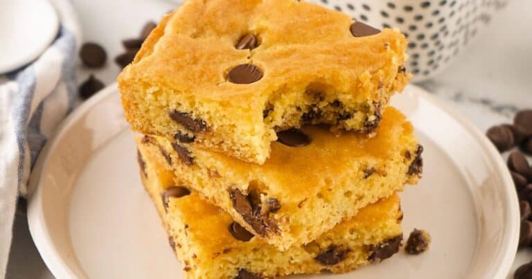 These chewy chocolate chip cookie bars made with cake mix combine the buttery flavor of chocolate chip cookies with the fluffy texture of cake in an easy 5-ingredient dessert that’s quick to mix and bake.