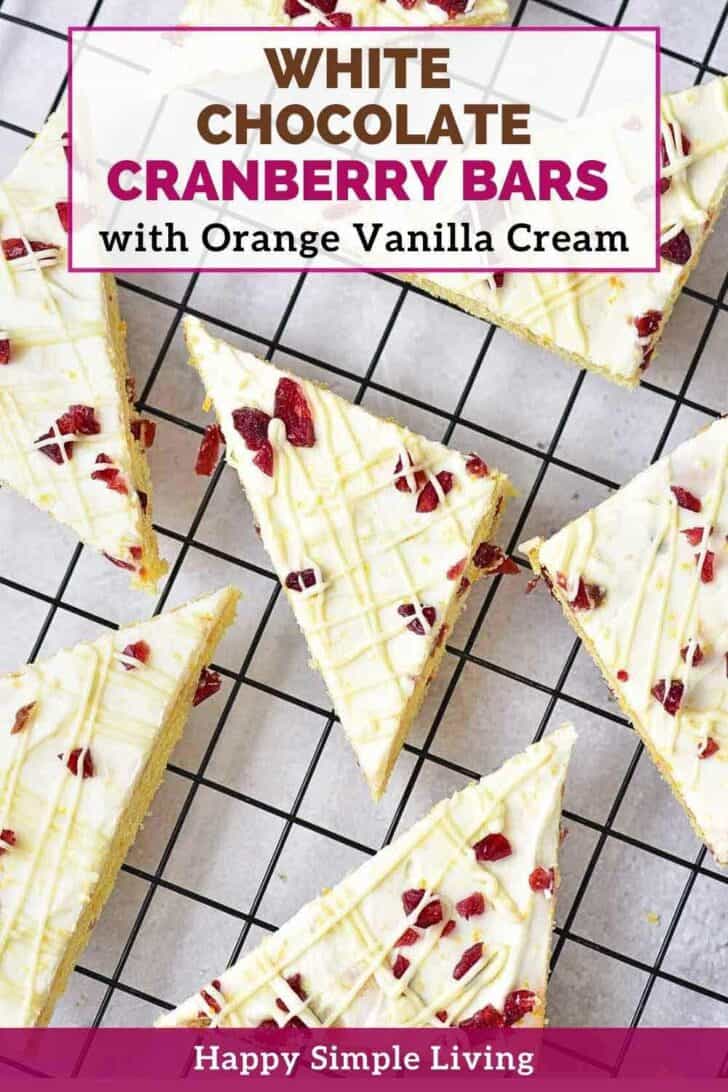 Festive Flavors: The combination of tangy cranberries, sweet white chocolate, and citrusy orange vanilla cream cheese frosting makes these bars perfect for the holiday season and special occasions.